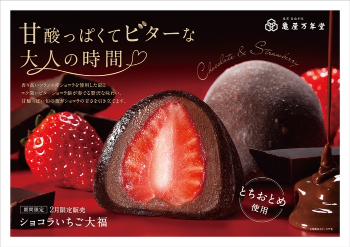 株式会社亀屋万年堂(本社・工場:神奈川県横浜市都筑区)は、「旬のおいしさを贅沢に味わう」をコンセプトに旬のフルーツを使用した「贅沢フルーツ大福」を各月、期間限定で販売いたします。2月は甘酸っぱい旬の苺と、香り高いフランス産ショコラを使用したちょっとビターで大人の味わい『ショコラいちご大福』(1個270円(税込)・期間限定)を直販店舗(東京・神奈川28店舗)にて販売いたします。