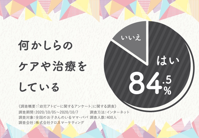 お子さんの肌トラブルに対して、何かしらのケアや治療はされていますか?という設問に対し、84.5%ものママ・パパが肌トラブルケアしているという回答に。