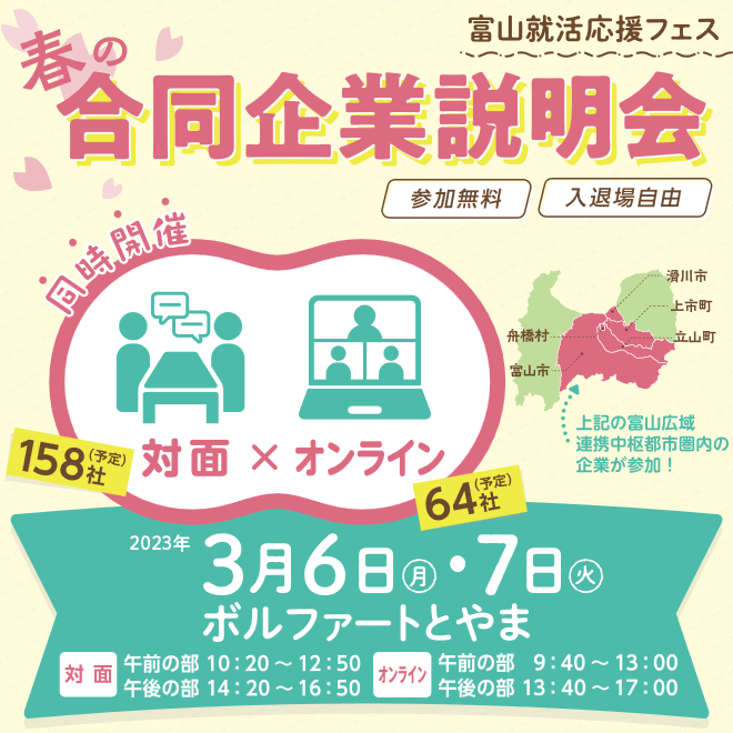 【対面×オンライン同時開催】富山の優良企業158社が集結!「春の合同企業説明会」3月6日・7日/富山市主催