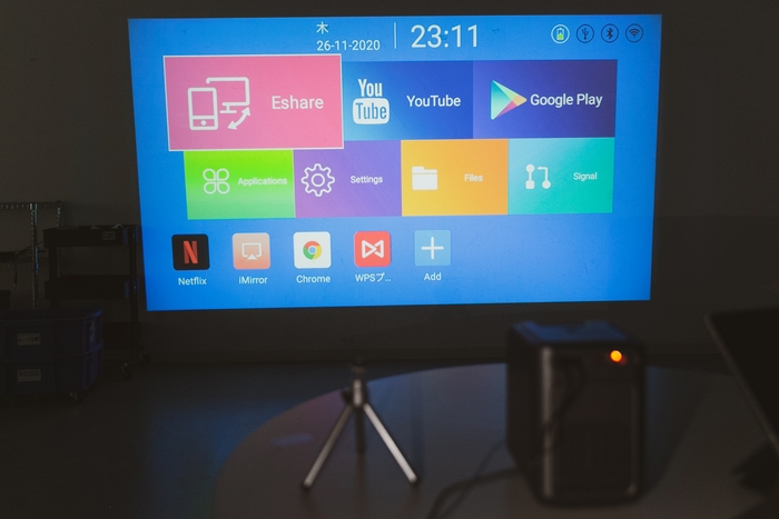また、無線でスマホやタブレットの画面を投影することもできるため、ゴチャゴチャしているプロジェクターのイメージとはかけ離れたスッキリ、スマートな見た目になります。