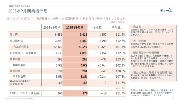 2025年9月期の業績につきましては、売上高は、店舗数の増加やリピート施策の強化により店舗の売上高が増加することで、前年比111.4%の7,413百万円を見込んでおります。売上総利益は、製造効率の更なる向上等により、前年比112.6%の4,389百万円を見込んでおります。販売費及び一般管理費は、人事施策の継続による人財定着に伴う人件費増、マーケティング強化に伴う広告宣伝費増、店舗リニューアルに伴う修繕費増、資本金増に伴う租税公課増により、前年比112.5%の4,090百万円を見込んでおります。親会社株主に帰属する当期純利益は、資本金増に伴う税金費用の増加があるものの、前年比111.7%の185百万円を見込んでおります。