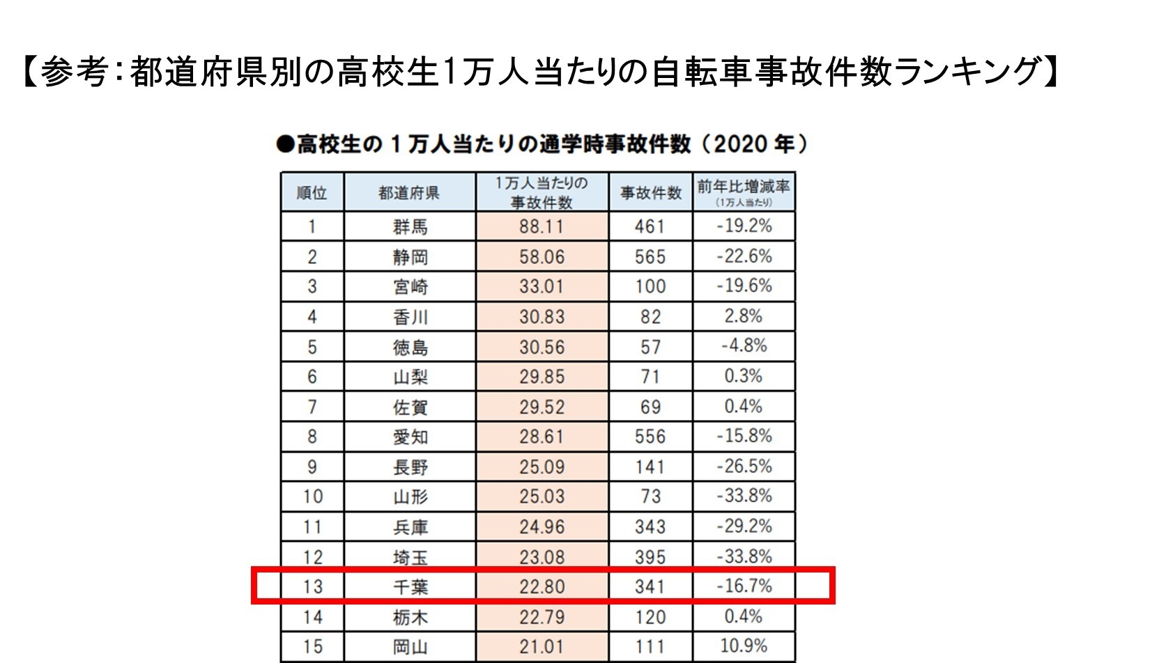 千葉県は中学生・高校生の通学時の自転車事故が多く、当委員会の調査では、2020年に発生した1万人あたりの自転車事故件数において、高校生はワースト13と事故件数が多い状況です。千葉県では自転車利用者の悲惨な事故を減らすため、県交通安全条例の改正がなされ、自転車保険の加入義務化のほか、自転車に乗る際のヘルメット着用を努力義務化しています。