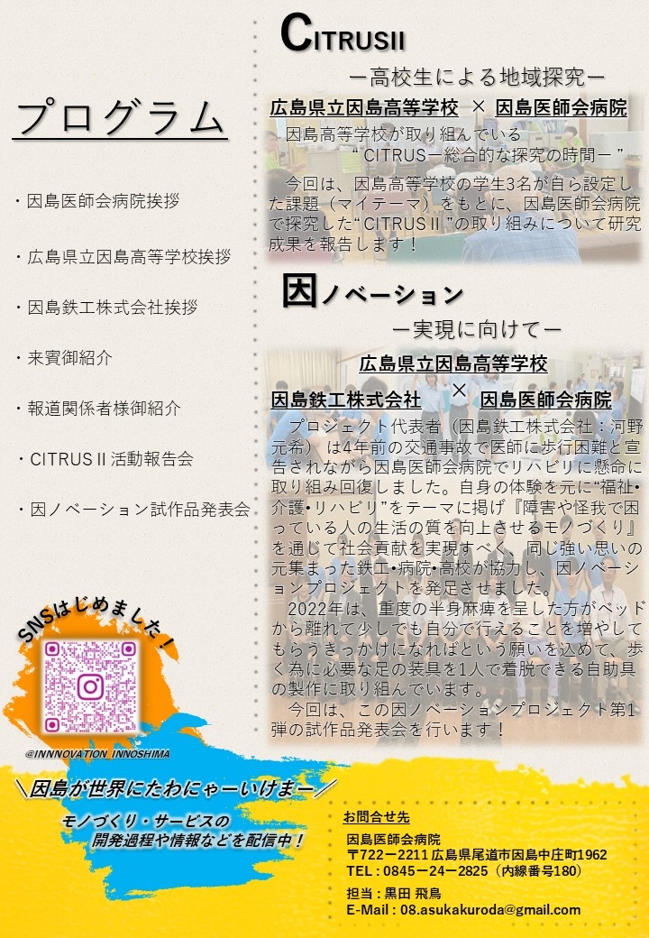 広島県尾道市の人口2万人ほどの島「因島」にある因島鉄工株式会社、因島医師会病院、因島高校の3者は共同して日常生活動作にお困りの患者様の生活の質を向上させるモノやサービスを発案し、2023年3月に成果物をお披露目いたします。