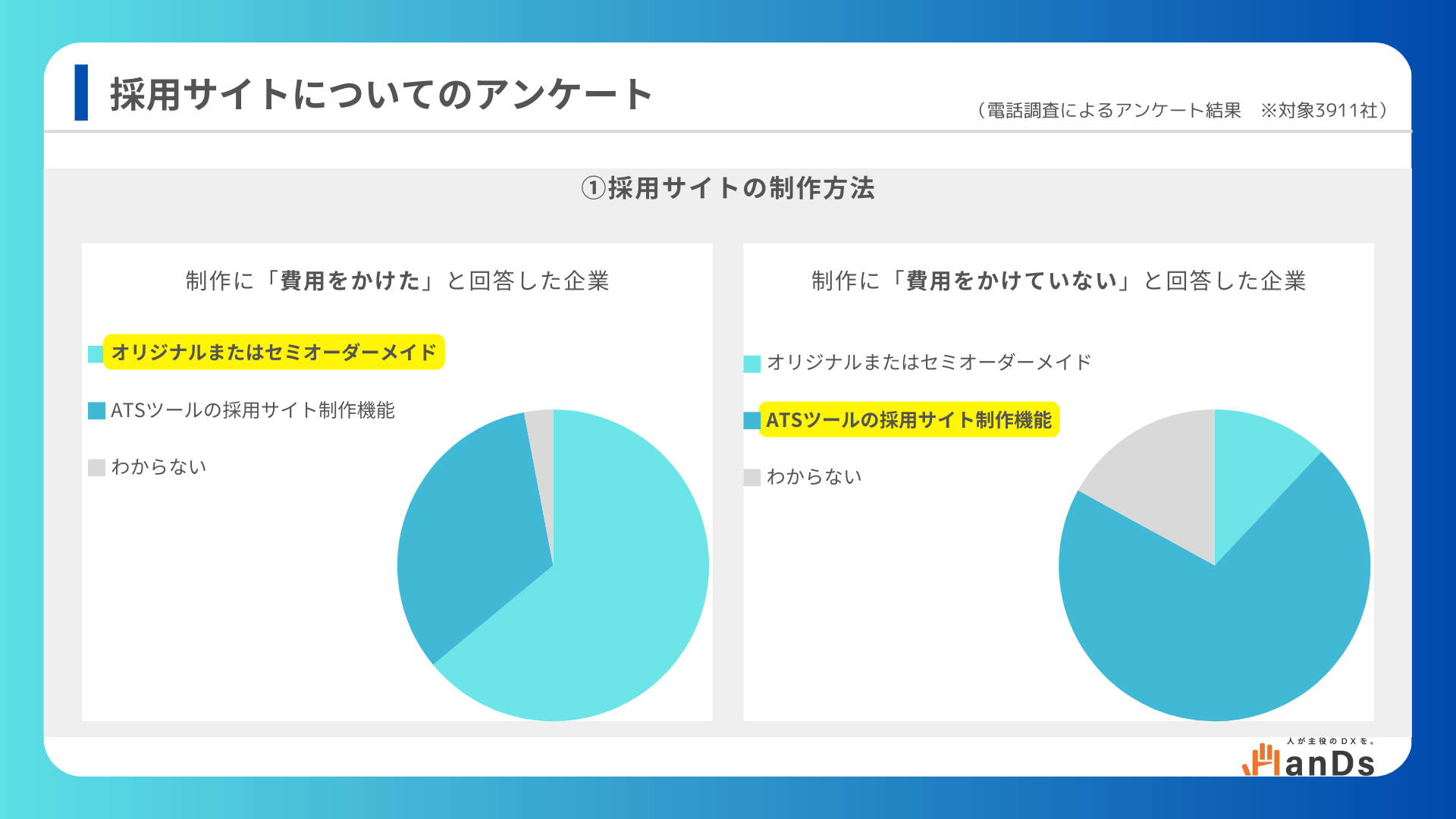 前回のアンケートから、「採用サイト保有企業の21%は制作に一切費用をかけていない」ことがわかりました。このことから、従来の『採用サイトはお金をかけて作るもの』という常識が変わりつつあり、企業が予算を抑えつつ効果的な採用サイトを作る方法を模索している状況がうかがえます。