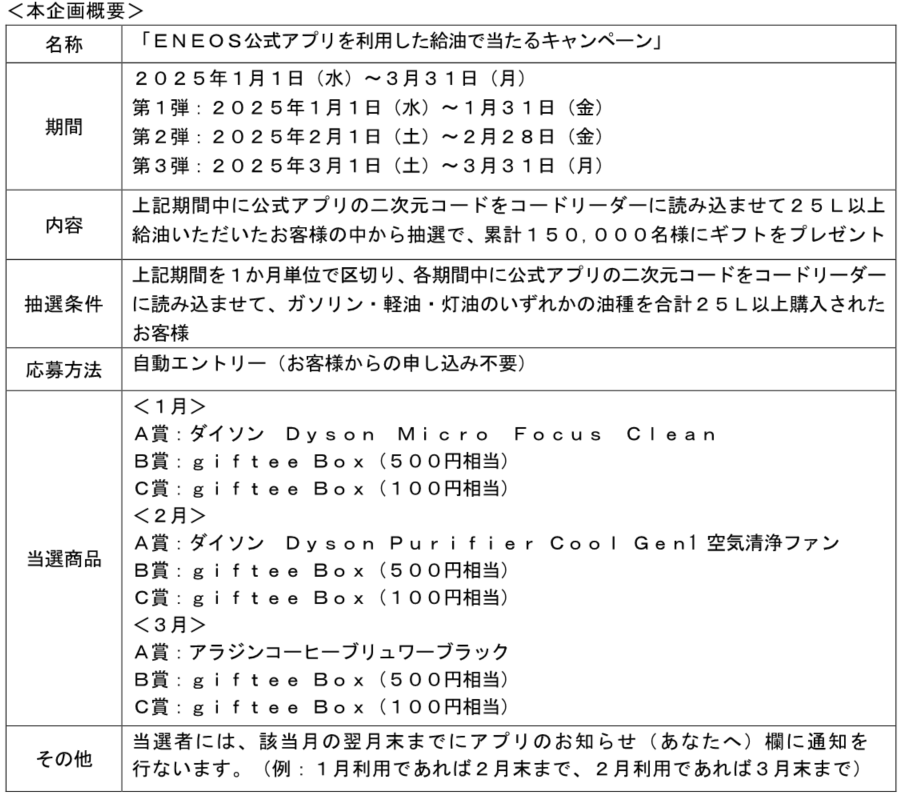 当社(社長:山口 敦治)は、2025年1月1日(水)から3月31日(月)まで、ENEOSのサービスステーション(以下、「SS」)において、ENEOS公式アプリをご利用いただいたお客様を対象に、豪華家電などのギフトが当たる「ENEOS公式アプリを利用した給油で当たるキャンペーン」(以下、「本企画」)※1を実施しますので、お知らせいたします。