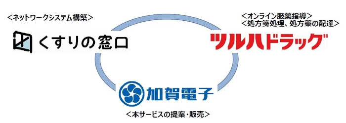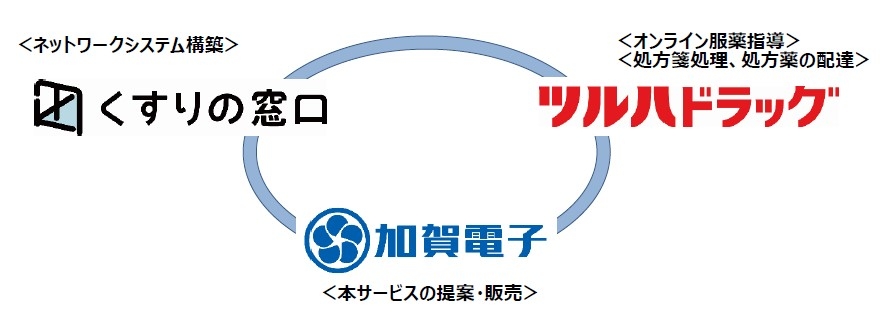 本サービスの開発にあたっては、「くすりの窓口」がネットワークシステムを構築、 ツルハが展開するドラッグストア「ツルハドラッグ」がオンライン服薬指導、処方箋の 処理および処方薬の配達を行い、当社は、本サービスの提案・販売を行います。