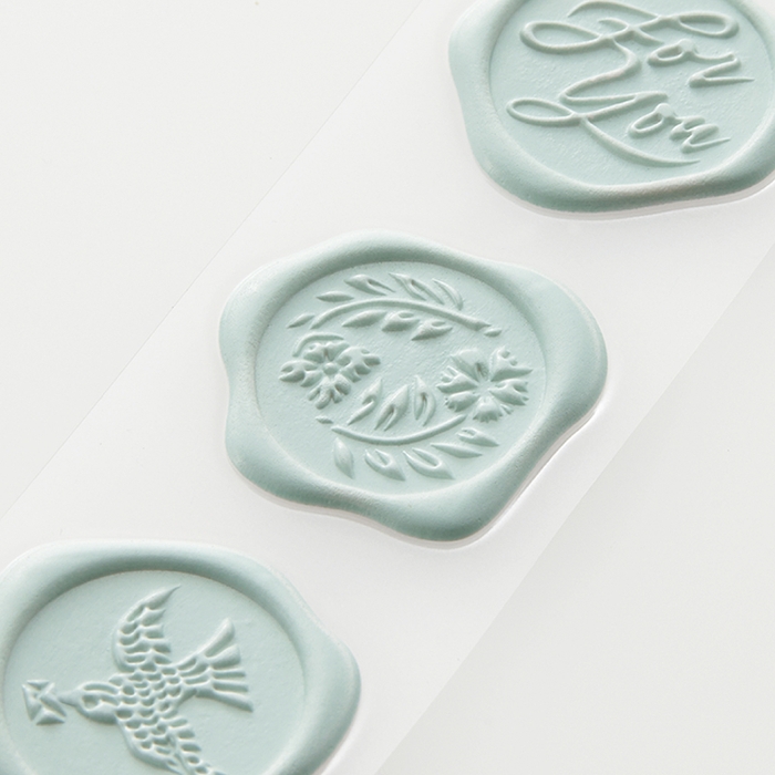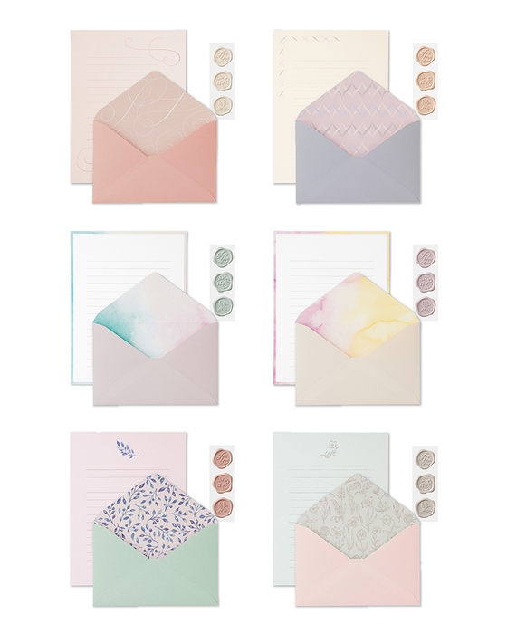ラインアップは「カリグラフィー」「水彩」「花」などをテーマにデザインした6種類です。それぞれに「For you」「花」「鳥」の模様のシーリングワックス風シール3枚がセットになっています。いずれもニュアンスカラーを採用し、柔らかく上品な印象に仕上げています。