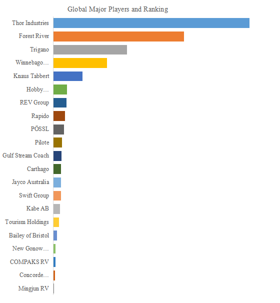 YHResearchのトップ企業研究センターによると、RV車の世界的な主要製造業者には、Thor Industries、Forest River、Trigano、Winnebago Industries、Knaus Tabbert、Hobby Wohnwagenwerk、Rapido、REV Group、PÖSSL、Piloteなどが含まれている。2024年、世界のトップ10企業は売上の観点から約85.0%の市場シェアを持っていた。