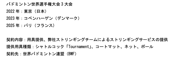 2022年東京大会からのバドミントン世界選手権3大会のオフィシャルサプライヤーに決定 シャトルコック等の用具とストリンギングサービスを提供