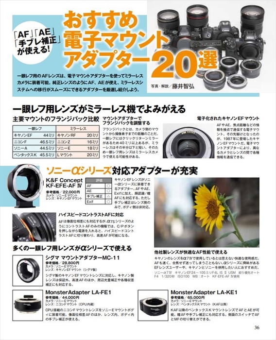 このほかニューレンズレポートでは、シグマのArtシリーズ2本/20ミリF1.4と24ミリF1.4や、富士フイルムXシリーズの高倍率ズーム/XF18~120ミリF4、開発発表され今秋発売予定のタムロン50~400ミリF4.5-6.3Di Ⅲ VC VXDなどを紹介。人気連載・伊達淳一のレンズパラダイスでは、小型軽量で高い描写性能を併せ持つEマウント大口径レンズ、シグマ16~28ミリF2.8 DG DNとソニーFE50ミリF1.2 GMを徹底チェックします。