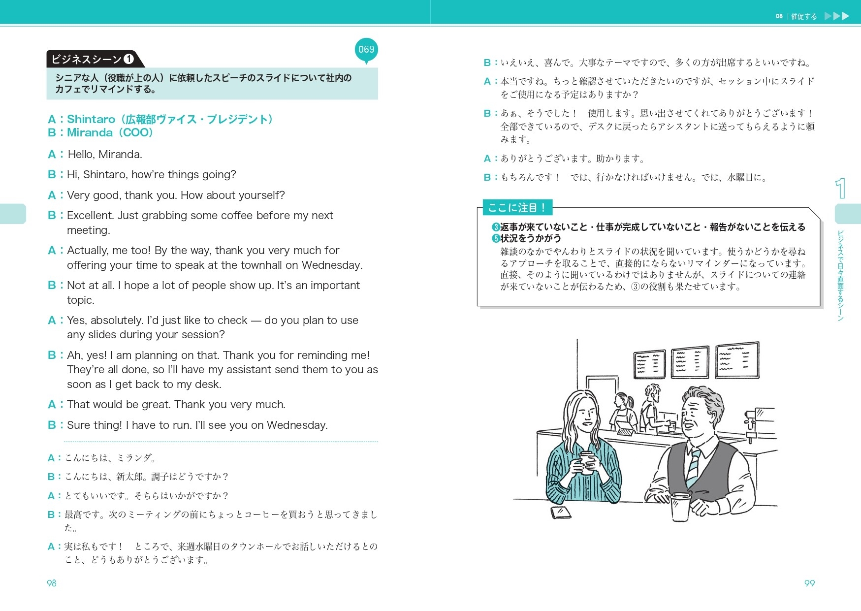 「答えたくない質問をかわす」「目上の人に催促する」「仕事の依頼や誘いを断る」など対応の仕方が難しい26のビジネスシーンを厳選して取り上げ、うまく切り抜けるためのプロフェッショナルなアプローチ方法とそのまま使えるシンプルな英語のフレーズを満載しています。