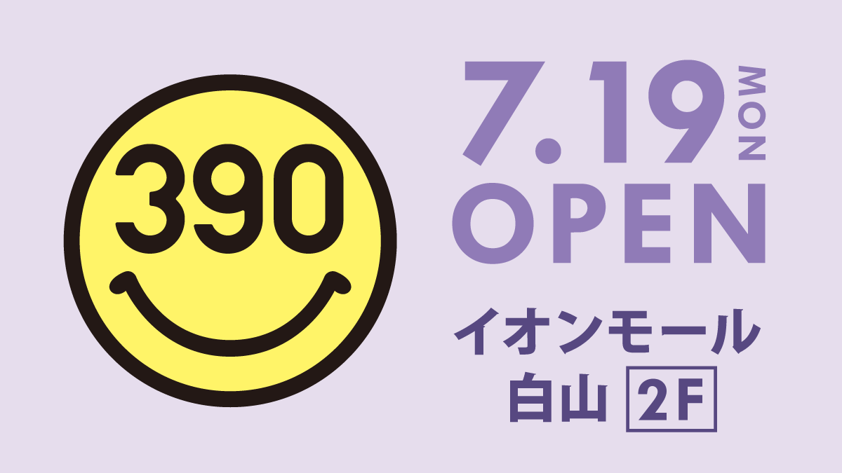 待望の石川県初出店となる全品390円(税込429円)の『サンキューマート』が、7月19日(月)グランドオープンの『イオンモール白山』にオープンいたします!