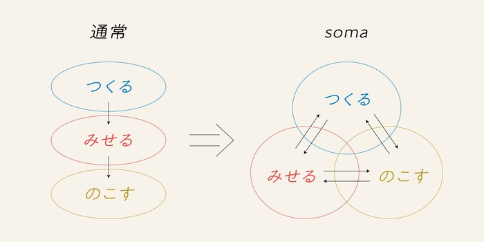 つくることが日常である風景と、人のつながりが育っていくオープンな場が同時に存在することで、作ること・見ること・残すことが相互に行き来し、境界を横断していく。そんな流動的で多層的な構成が、soma全体の在り方となります。