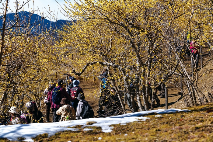 標高497メートルの宝登山山頂一帯約15,000m2に、今シーズンから加わった新種のロウバイ(福禄寿)別名『宝登のかがやき』を含む5種類・計約3,000本のロウバイが植栽されています。晴れた日には山頂から武甲山、両神山、秩父の町並みなどが一望でき、ロウバイの濃厚な甘い香りとともに関東一のロケーションをお楽しみいただけます。