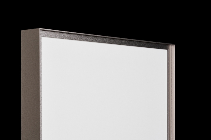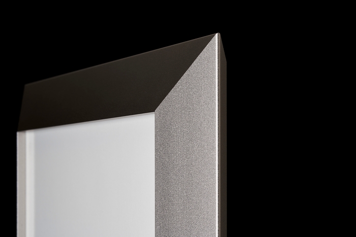 額に入れた作品は、正面から眺めるだけではありません。横や斜めから眺める時間も多いです。また、照明や日光など様々な角度から光が当たります。これら様々な角度からのシーンを想定して設計されたのが「ALUMIUMシリーズ」です。光の当たり具合で壁に掛けた額が宙に浮いたように見えたり、微妙に額縁に傾斜を入れることで床置きや卓上にそのまま置いてもスタイリッシュに見える工夫がされています。