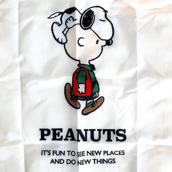 中央にキュートな表情のスヌーピーのイラストがあり、収納袋もついた便利なバッグ♪素材はリップストップ生地で、軽くて丈夫なので重い荷物を運ぶのにも活躍してくれます。