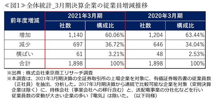 ≪図1≫は、株式会社東京商工リサーチより開示された3月期決算の上場企業1,898社の従業員増減の推移を示した表である。これによると、2020年3月期から2021年3月期にかけて従業員数が減少した企業の割合が増加(34.04%→36.72%)していることがわかる。