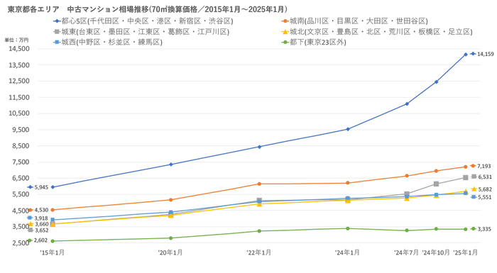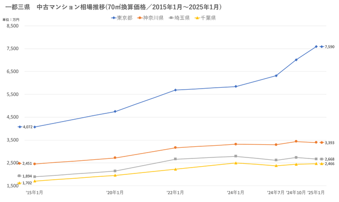 「不動産×WEB×ビッグデータ」の領域で、さまざまな不動産テックサービスを展開する株式会社ワンノブアカインド(本社:東京都港区、代表取締役社長:川島 直也、以下当社)は、当社が運営しているマンション情報サイト「マンションレビュー」の保有データを元に、全国の2025年1月の中古マンション相場を調査。坪単価をベースに70㎡での価格に換算した「中古マンション価格」*1について、10年前・5年前・3年前・前年からの推移を都道府県別・エリアごとにまとめましたので、発表いたします。
