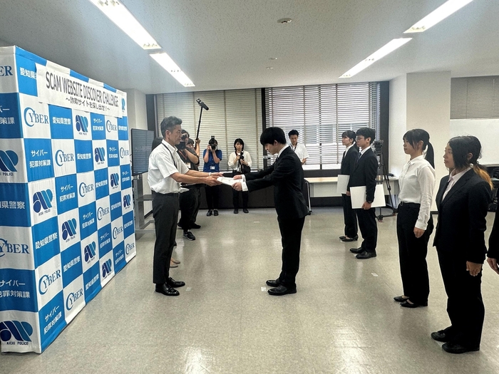 8月22日に愛知県警察本部で「SCAM WEBSITE DISCOVER CHALLENGE~詐欺サイトを探し出せ!~」の表彰式が行われ、法学部法学科3年の榊原啓示さんがサイバー局長賞を受賞しました。