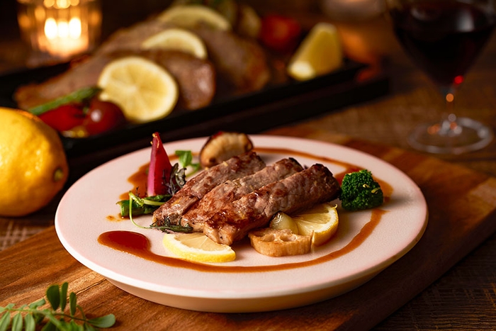 メインのお肉料理は長崎県・佐世保名物のレモンステーキ*。レモンを使用したさっぱりとしたステーキソースで何皿でも食べたくなる美味しさです。