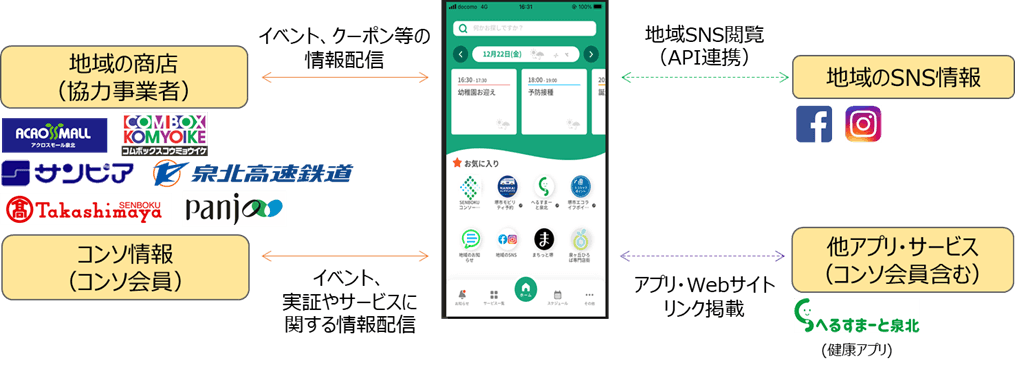 スマートシティに関するサービスに加え、地域の企業や団体が提供する情報やサービスを連携し、生活者一人ひとりの興味関心、ヘルスケア志向に見合った情報やサービスを提供できる総合ポータルアプリです。