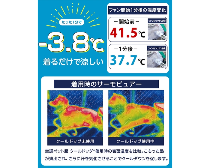 今回の新商品「COOL DOG(R)」(クールドッグ)はファンを稼働させた1分後、温度は41.5度に対して37.7度と、服の中に涼しい空気を循環、気化熱を利用して効率よく体温を下げることが実証されており、実用新案も出願中です。