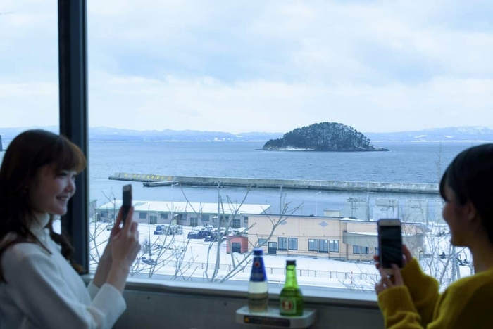 東北エリアの旅行は自家用車やレンタカーでの移動が主流ですが、ローカル鉄道で旅行することで、車窓からの景色のすばらしさを再発見できます。三沢市から青森市に向かう途中、「浅虫温泉駅」の近くに差し掛かると、陸奥(むつ)湾と、湾内にある夏泊(なつどまり)半島の冬景色が一望できます。線路が車道よりも高い位置にあるため見ることができる絶景です。