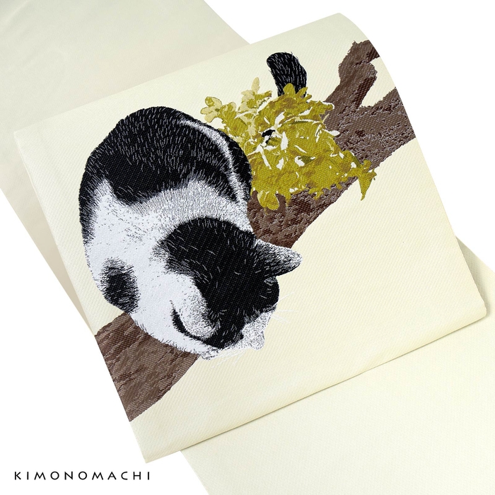 ややグレイッシュなアイボリーの地。お太鼓部分は樹上に座る黒白ぶちのハチワレ猫がたれ先のモンシロチョウを見つめているデザイン。胴の部分はモンシロチョウ。茶色の幹にオリーブグリーンの葉。黒白のぶち猫は、毛並みの柔らかさを感じさせるほど繊細な織りで表現されています。裏は明るいアイボリー。