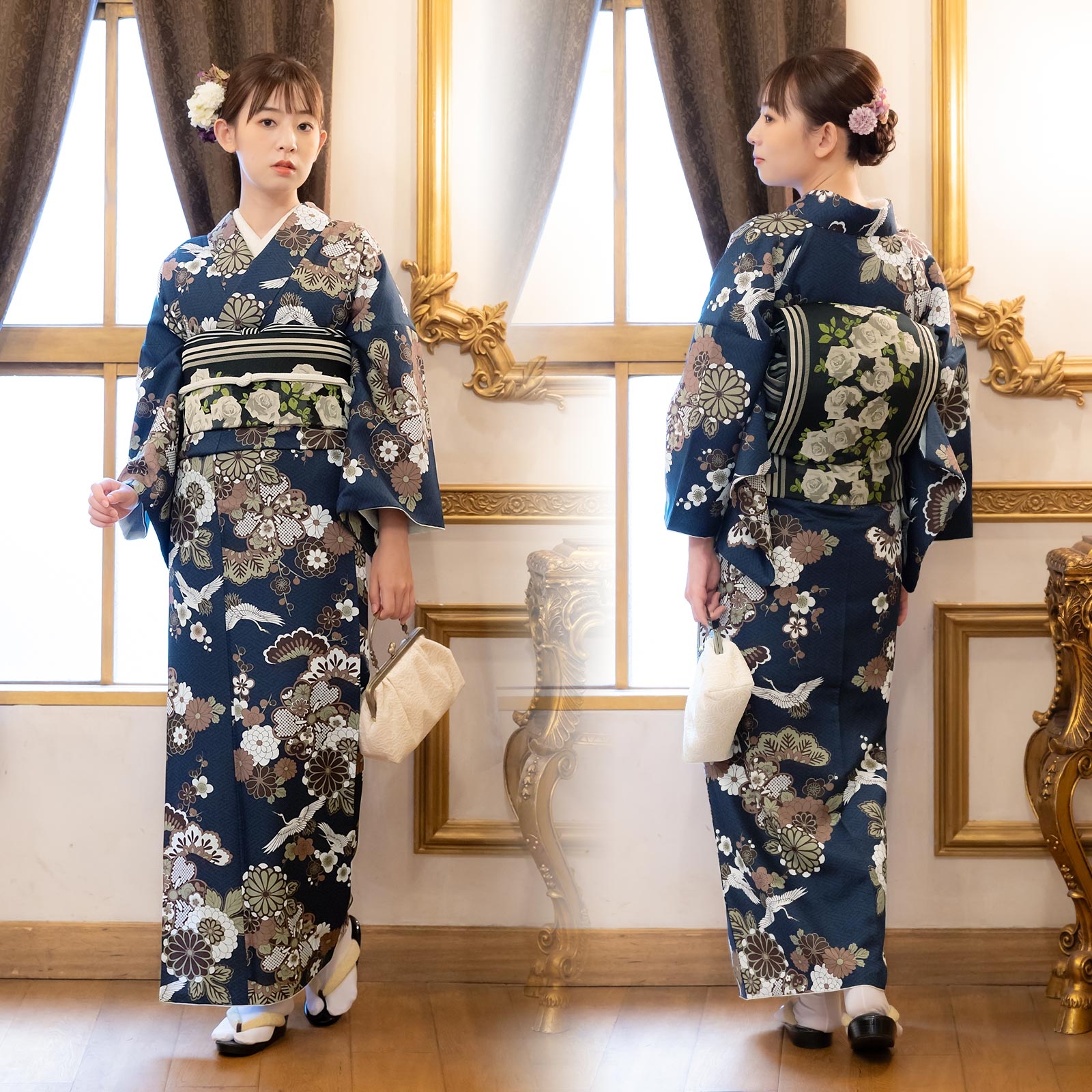 濃紺の地に黒の紗綾形が全体に表現されています。その上に捻じ花や菊、梅などさまざまな花紋が散らされ、鶴が飛ぶデザイン。白に退紅色や灰緑色、こげ茶色のくすみ系の配色が古典的な柄をモダンな雰囲気に見せてくれます。