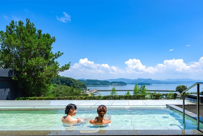 露天風呂の目の前には大村湾が一面に広がり、まるで海と繋がっているよう。 温かいお湯のなかから時間ごとに表情の変わるオーシャンビューを堪能できます。海からのやわらかな風を感じながら、くつろぎのひと時をお過ごしください。