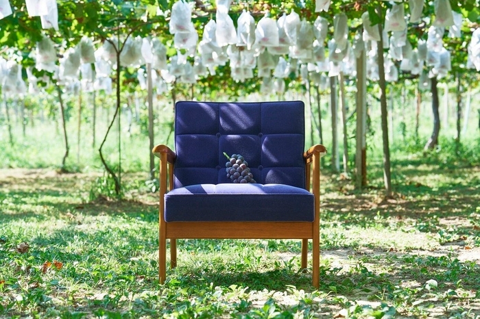 今回返礼品として提供するのは、当社・愛知県東浦町の工場で生産される「カリモク60」の限定モデルです。東浦町の特産品であるぶどうの「巨峰」をモチーフに、糸から選定してオリジナル布地を製作しました。巨峰の果皮を思わせる深みのある紫色のモケット織り布地は、糸から染め上げることで巨峰の深い色合いを忠実に再現しています。また、モケット織り特有の繊細な光沢は、見る角度や光の加減によって、巨峰の皮に付く白い果粉(ブルーム)をより忠実に表現しています。