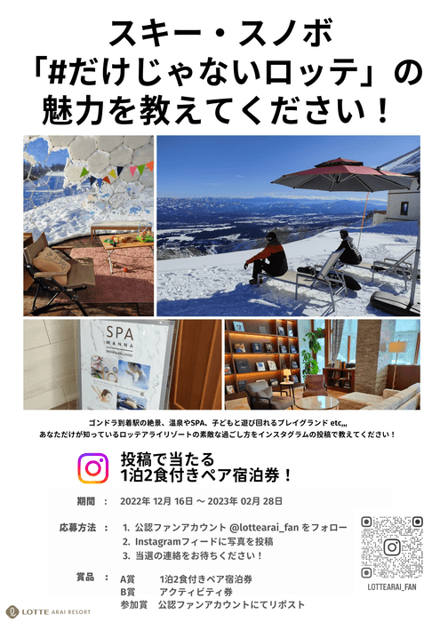 株式会社LOTTE Hotel Arai(本社:新潟県妙高市、代表取締役:中谷 高士、以下 ロッテアライリゾート)では、2022年12月16日(金)~2023年2月28日(火)で『 #だけじゃないロッテ Instagramフォトキャンペーン 』を開催しています。また、Instagramフォトキャンペーン開催に併せて、ロッテアライリゾート公認ファンアカウントが誕生しました。ロッテアライリゾートの「だけじゃない」素敵な一面を是非写真で切り取って、 #だけじゃないロッテ をつけてInstagramに投稿してください!