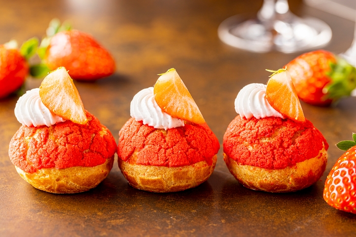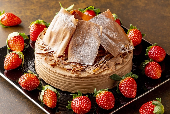 とろける苺ムースの「ストロベリードリップケーキ」は、苺をたっぷりとあしらい、クラッカーをイメージしてポップで華やかにデコレーション。「苺とショコラ」は、ベルギー産のチョコレートクリームで苺とホワイトチョコガナッシュをサンドし、上品な味わいに仕上げました。