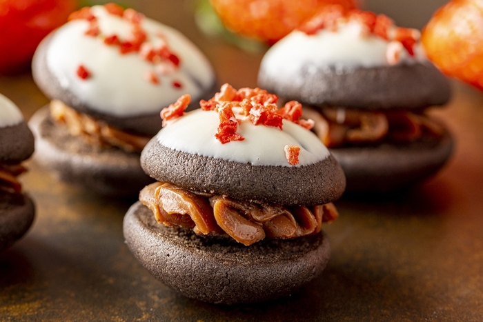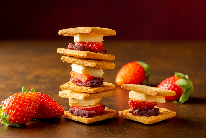 甘い「ショコラプリン」は甘酸っぱい苺とほろ苦キャラメルソースが運命的に出会い、リピートしたくなる一品です。可愛らしい「真っ赤なクッキーシュー」やココアたっぷりのしっとり「ウーピーパイ」、王道の「ストロベリーショートケーキ」、ほんのり塩味がくせになる「苺あんバターサンド」、ジューシーな苺とあんこのバランスが抜群な「苺大福」の和スイーツなど、全14種類を一緒に並べて苺スイーツを愛でるひと時をお楽しみください。