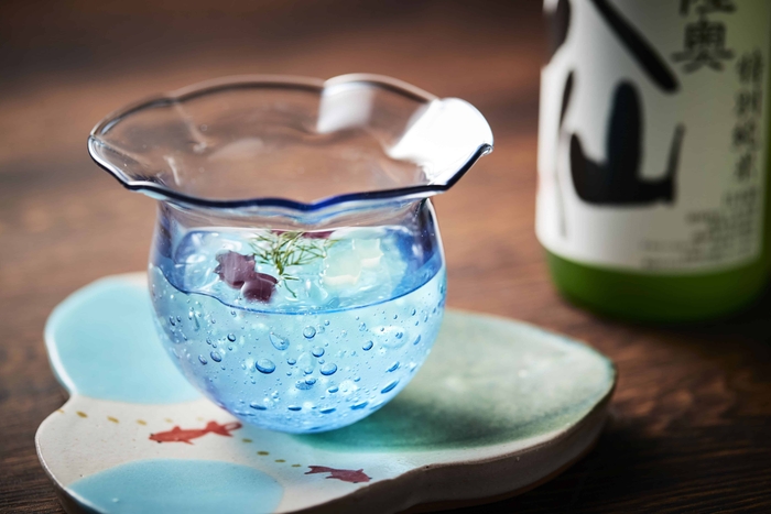 津軽びいどろの器に地酒を使用した「大人の日本酒ゼリー」を提供します。地酒を使用したクラッシュゼリーにカシス味とりんご味の金魚型のゼリーが入った、大人向けのスイーツです。冷たいゼリーを一口食べれば、地酒の香りが口の中に広がります。金魚が悠々と泳いでいるかのような情景を眺めながら、味わうことができます。