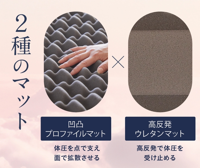 体を点で支える凹凸プロファイルマットと体圧を受け止める高反発マットの、2種類のマットを内蔵しています。