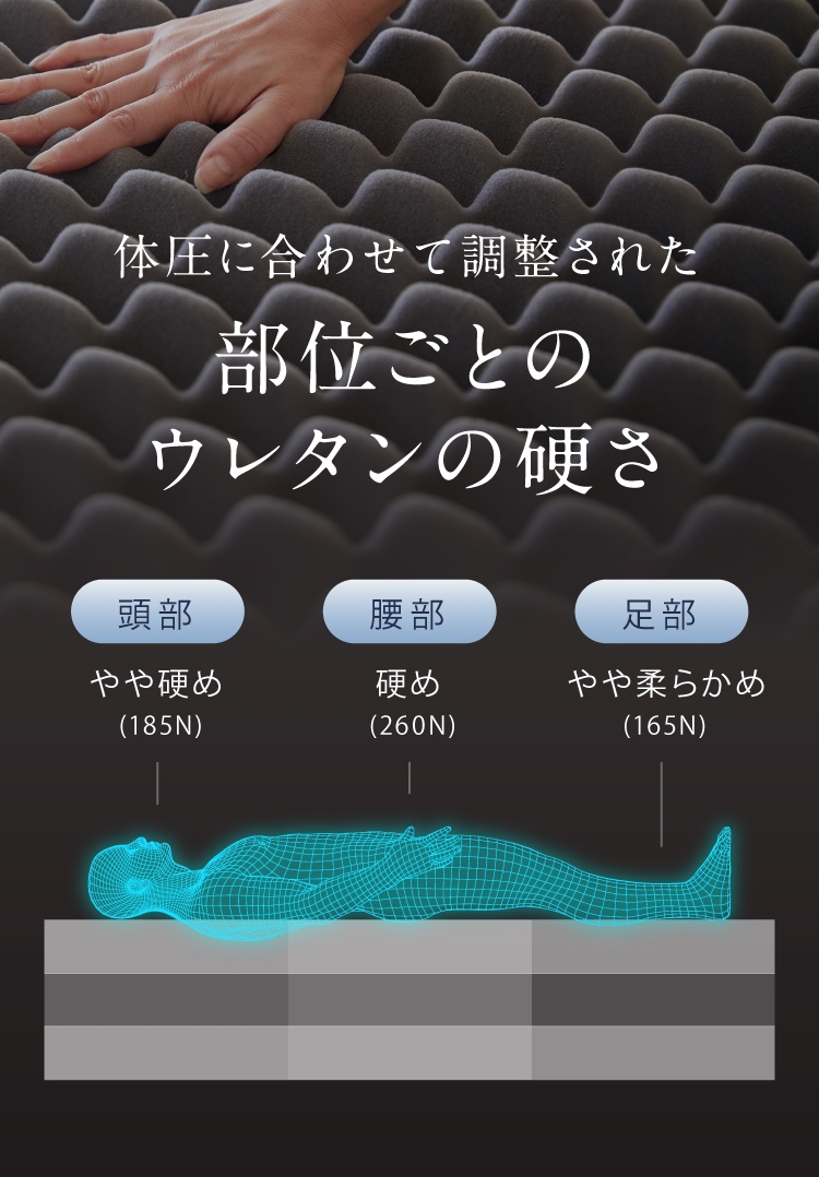 頭部はやや硬め、腰部は硬め、足部はやや柔らかめと、それぞれの部位ごとにかかる体圧に合わせて、硬さの違うウレタンを使用しています。