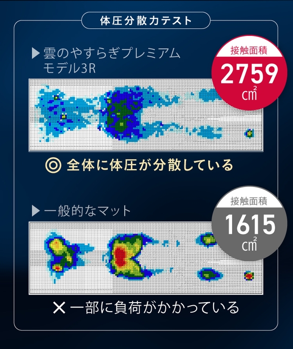 接触面積が一般的なマットレスと比べ約1.7倍に増え、体にかかる負担をより軽減します。