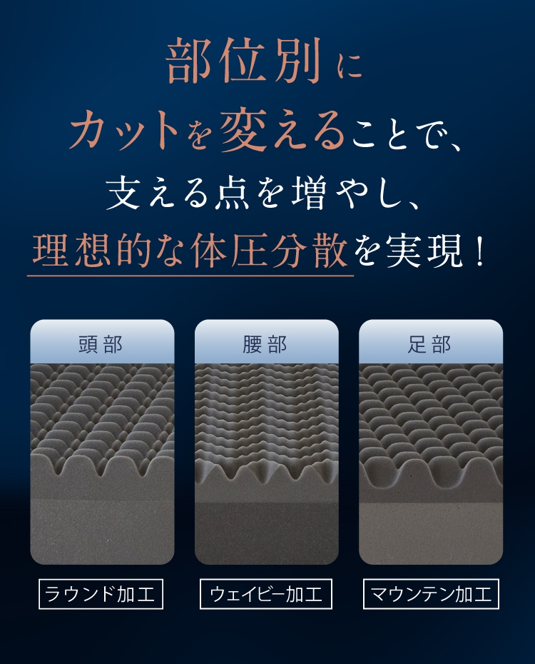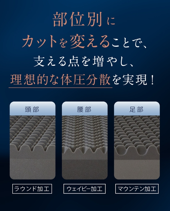 さらに、頭部はラウンド加工、腰部はウェイビー加工、足部はマウンテン加工と、部位ごとにカットを変え、体圧分散力もアップ。