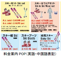 簡単なフレーズ(英語+中国語)と写真入りのPOPを用いて、自分の意思で止まれるようになるまでを目指します。12月2日(土)の開講後、スキースクールは約630名※、スノーボードスクールは約280名※の利用がある人気のレッスンです。