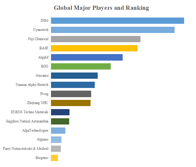 QYResearchのトップ企業研究センターによると、アスタキサンチンの世界的な主要製造業者には、DSM、Cyanotech、Fuji Chemical、BASF、Algalíf、BGG、Atacama、Yunnan Alphy Biotech、Piveg、Zhejiang NHUなどが含まれている。2022年、世界のトップ5企業は売上の観点から約57.0%の市場シェアを持っていた。
