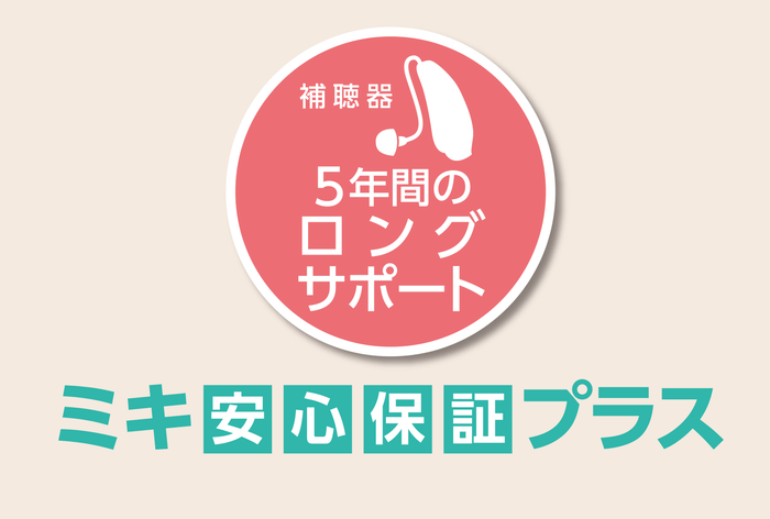 補聴器のメーカー保証期間は2年~3年が一般的ですが、本保証サービスの対象となる補聴器「らくみみMKシリーズ」には、今まで以上に安心して補聴器をご使用いただけるように、パリミキ独自の「ミキ安心保証プラス ライト」(最大5年)を付け販売をいたします。今まで補聴器の故障でお困りの経験がある方や、初めての補聴器のご使用で心配な方をサポートいたします。
