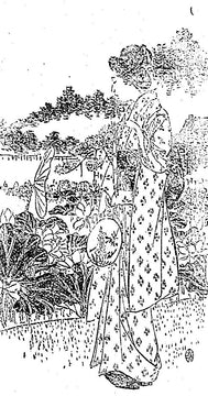 下谷区は、現在の台東区の一部になっている地区。医者の娘と思われる少女は、未婚の女性が結う文金の高髷に、中振りの単衣、緞子のお太鼓、黒塗りのぽっくりという晴れ着姿で、上野・不忍池の蓮を眺めています。