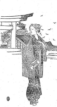 湯島天満宮の社内に佇む茶屋女と思われる女性。通称である湯島天神と掛けているのか、髪型は芸妓や若い女性の間で人気だった天神髷になっています。