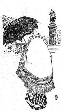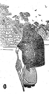麹町区の項では、桜が咲き誇る靖国神社にて、大村益次郎の銅像を見つめている良家の令嬢と思われる女性が描かれています。彼女が身につけている矢絣の着物、ショール、そして洋傘は、いずれも当時の女性の間で流行していたものです。