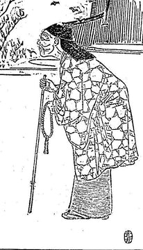 【京橋区】頭巾をかぶり亀甲柄の被布をまとう老婆