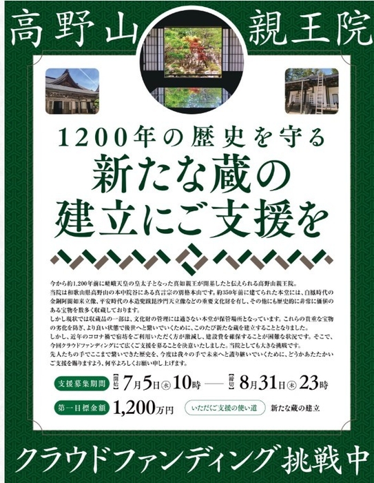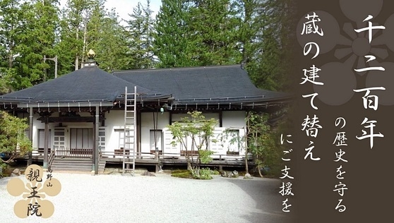 高野山別格本山 親王院(所在地:和歌山県伊那郡高野町、住職:川上 隆輝)は、重要文化財・宝物類をよい状態で後世へ繋いでいくために、蔵を建て替えるご支援をクラウドファンディングサイト「READYFOR」にて2023年7月5日(水)から開始しました。
