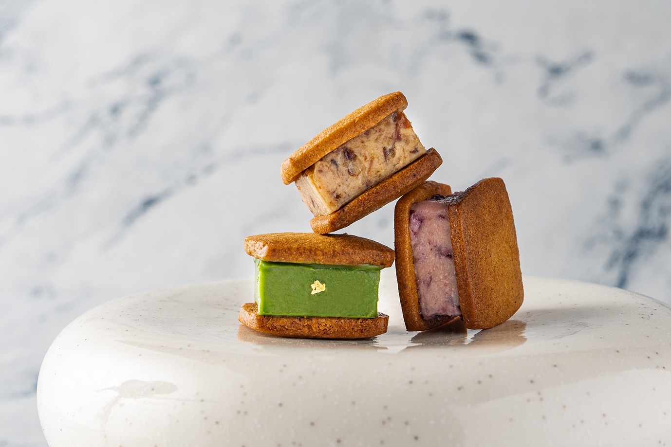 抹茶独自の香りと深い味わいを再現した和風のサンド。飾り付けの金箔で和の趣(おもむき)を演出しています。