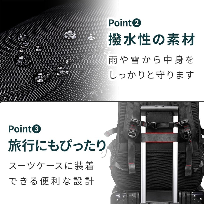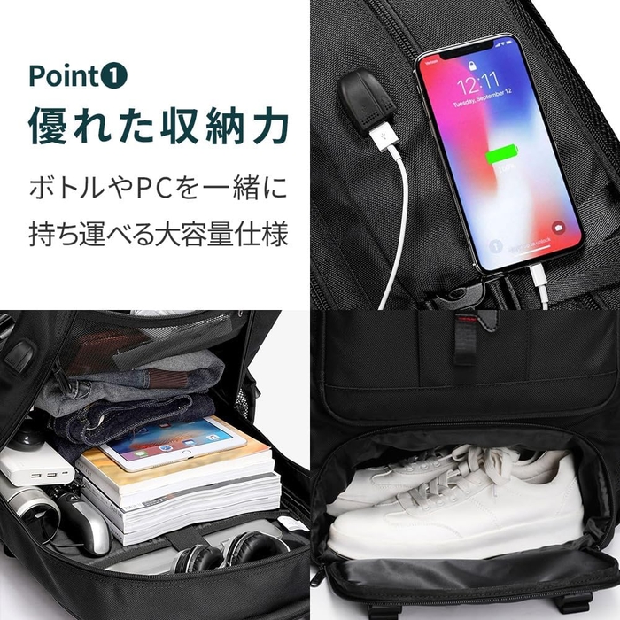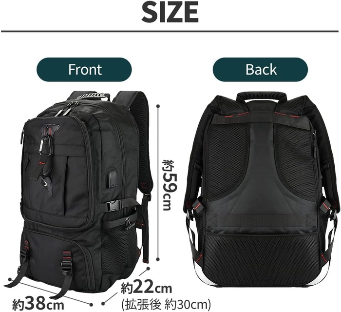 靴・着替え・タオル・水筒・書籍・電子機器・折り畳み傘などをまとめて持ち歩ける大容量設計。リュックサックの背面には外出先で荷物が増えても対応できるよう拡張機能が備わっています。さらにキャリーオンベルトを搭載しており、スーツケースの持ち手に引っ掛けられます。側面にはUSBポートが付いているため、デバイスを充電しながらの移動も可能です。