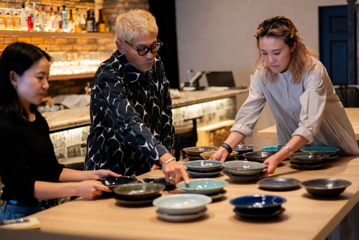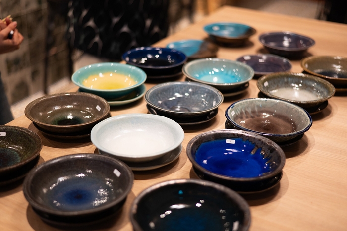 2023年10月某日。自分たちだけの信楽焼商品が作りたいというHESTA LIFEの想いを実現するため、丸十製陶とTHE HARVEST、HESTA LIFE 3社対面での話し合いが行われました。この日、製陶所の商品企画本部長・山野さんは、練りに練った15パターン(各中深皿&平皿)のサンプルを持参。どれもこれも個性豊かで、色味や模様、ゆがみ方にも一つひとつ違いがあり、その唯一無二の存在感が、「自分たちだけの信楽焼商品」の最大の魅力になると、一同確信しました。